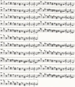 En el sistema clásico de escritura se necesitan para las ocho octavas ¡ÚNICAMENTE! y sin acudir a las abreviaciones: treinta líneas, diez fijas y veinte adicionales.