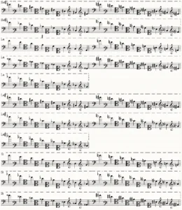 En otros términos: de los noventa y siete sonidos que hay en la música clásica en las ocho llamadas octavas, el sonido central DO o sea el número 49 de la serie, va en la línea fija, con lo cual queda dicho que se escriben cuarenta y ocho sonidos además del DO central por la parte superior,